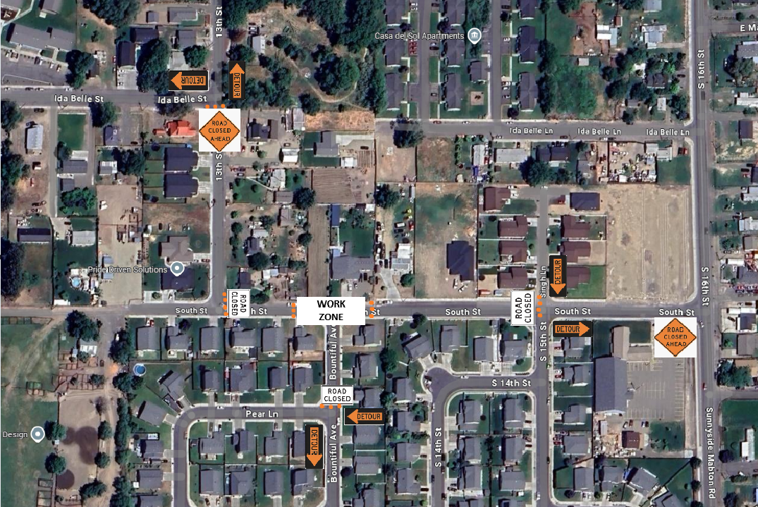 The City of Sunnyside Water Division will be installing 2 water services at 1310 South St. on Tuesday, 6/17/2025 from 6:30AM – 6:00PM. The following roads will be affected, 13th Street from Ida Belle St to South St, South St to S 15th St/Singh Ln intersection, along with Bountiful Ave to Pear Ln. If you have any questions, please call 509-837-5206.