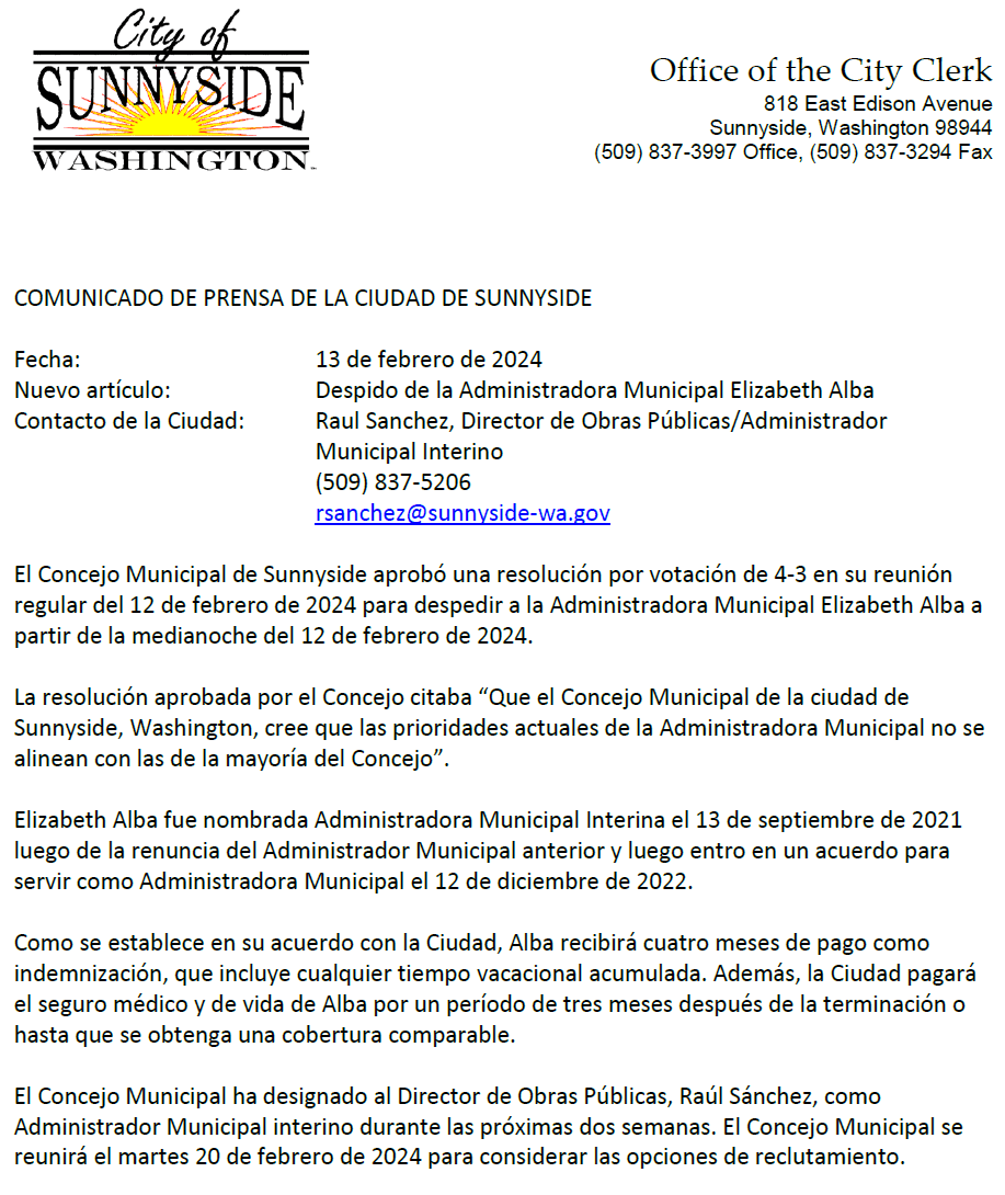 El Concejo Municipal de Sunnyside aprobó una resolución por votación de 4-3 en su reunión regular del 12 de febrero de 2024 para despedir a la Administradora Municipal Elizabeth Alba a partir de la medianoche del 12 de febrero de 2024.